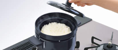 コンロに搭載された自動炊飯機能であれば、専用の容器がなくてもコンロ一つで驚くほどおいしいご飯が炊きあがります。