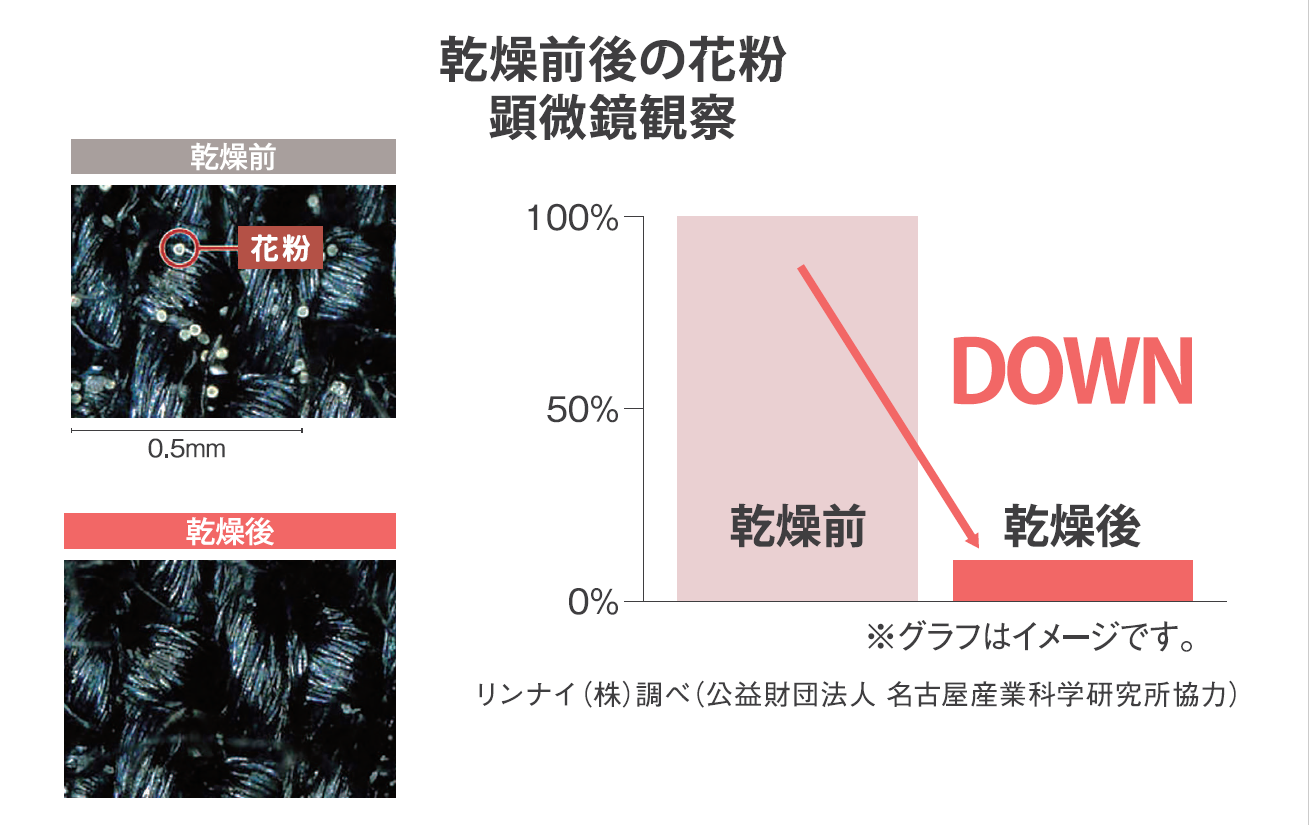 外に干さないから天気や季節も関係なし!衣類についた花粉中の荒れる物質も乾太くんで除去可能!