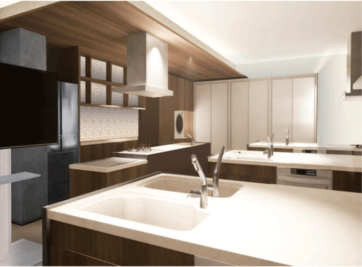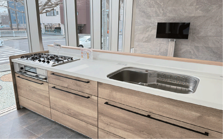 キッチン、リビング、エコカラットコーナーでは、最新のデザインと機能性を兼ね備えたキッチンを展示しております。