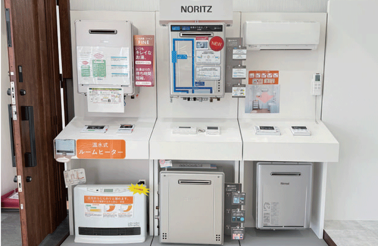 給湯器コーナーでは、給湯器の実機とリモコンの展示をしております。