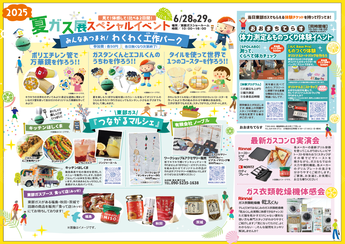 皆さんこんにちは遠藤です! いよいよ今週末、「2025夏ガス展大商談会」が開催されます✨ 地域の皆さまに感謝を込めて、楽しい企画をたくさんご用意しました! 🔥 見どころポイント🔥 わくわく工作パーク 万華鏡作りやうちわ作り、コースター作りなど 家族みんな楽しめるイベントです! 最新ガス機器の展示・体感会 実際に見て、触れて、体感できます! お手入れしやすいグリルでの実演会や SNSで話題の「乾太くん」の体感ができます! ★同時開催★おおまちてらす★ 体力測定&ものづくり体験イベント 当日東部ガスでもらえる体験チケットをもって行ってね! また前回のブログでもご紹介しました スペシャルイベント当日限定企画 アウトレットセール も開催! 特別価格でご用意しております! ぜひこの機会をお見逃しなく! 社員一同皆さまのご来場を心よりお待ちしております! ■■お問い合わせ■■ 東部ガス 福島支社 お客さま窓口グループ TEL.024-932-3335 #東部ガス #郡山市 #イベント #夏ガス展 #乾太くん