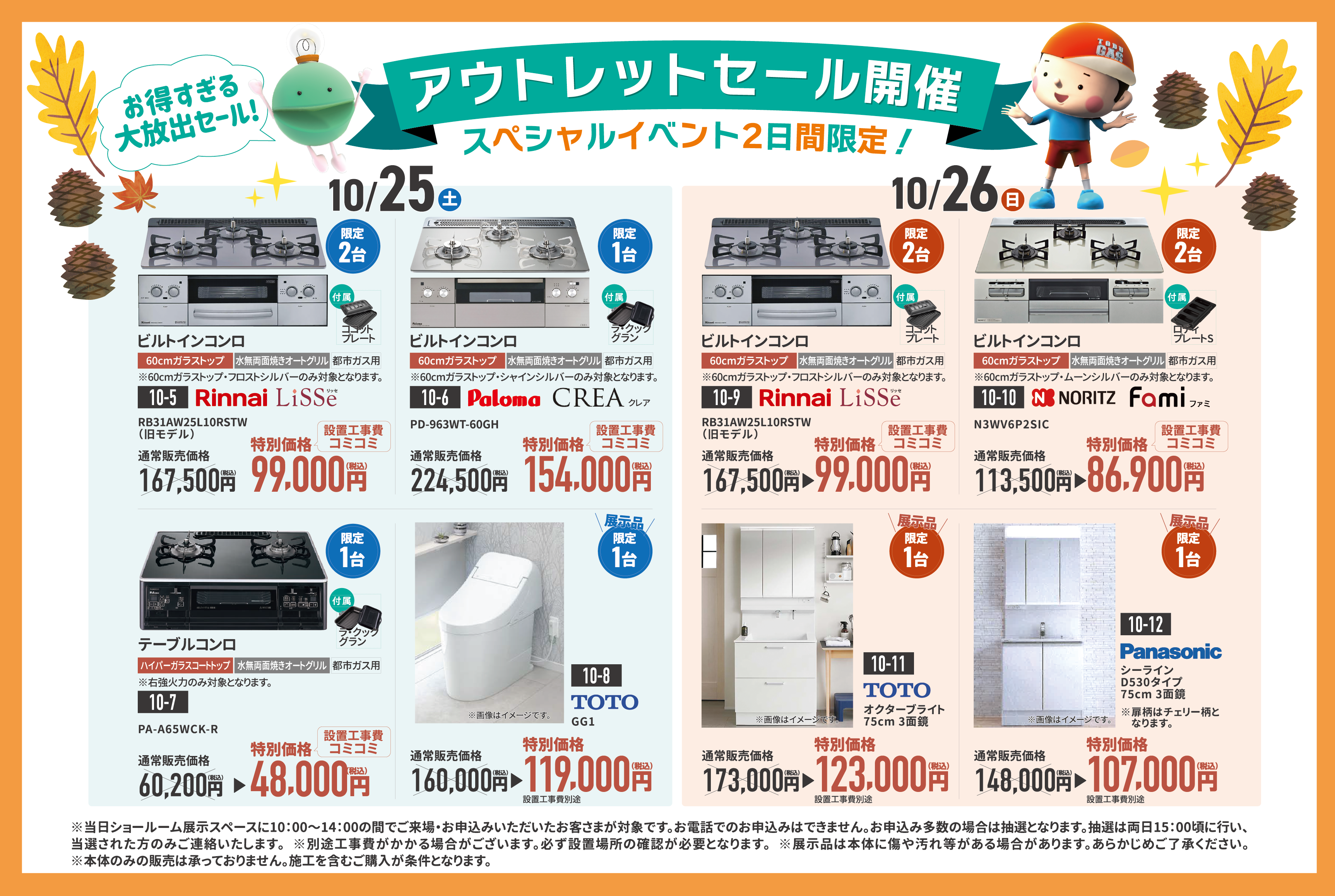 【お申込み時のご注意】 ※当日ショールーム展示スペースに10:00~14:00の間でご来場・お申込みいただいたお客さまが対象です。 ※お電話でのお申込みはできません。 ※お申込み多数の場合は抽選となります。抽選は両日15:00頃に行い、当選された方のみご連絡いたします。 ※別途工事費がかかる場合がございます。必ず設置場所の確認が必要となります。 ※展示品には本体に傷や汚れ等がある場合がございます。あらかじめご了承ください。 ※本体のみの販売は承っておりません。施工を含むご購入が条件となります。