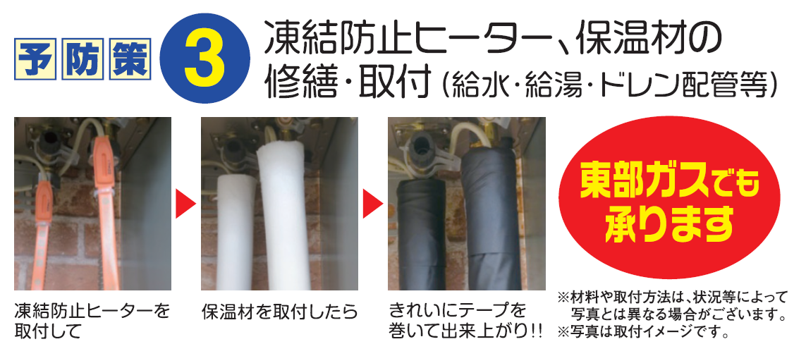 給水・給湯・ドレン配管への凍結防止ヒーターや保温材の取付や修繕も承っております