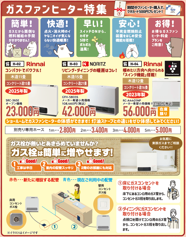 ガスファンヒーターをお使いいただくには、ガス栓が必要になります!