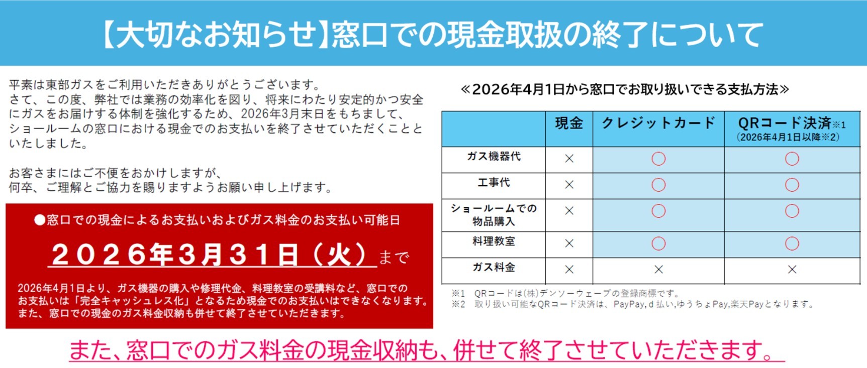 窓口でのガス料金のお支払いができなくなります。