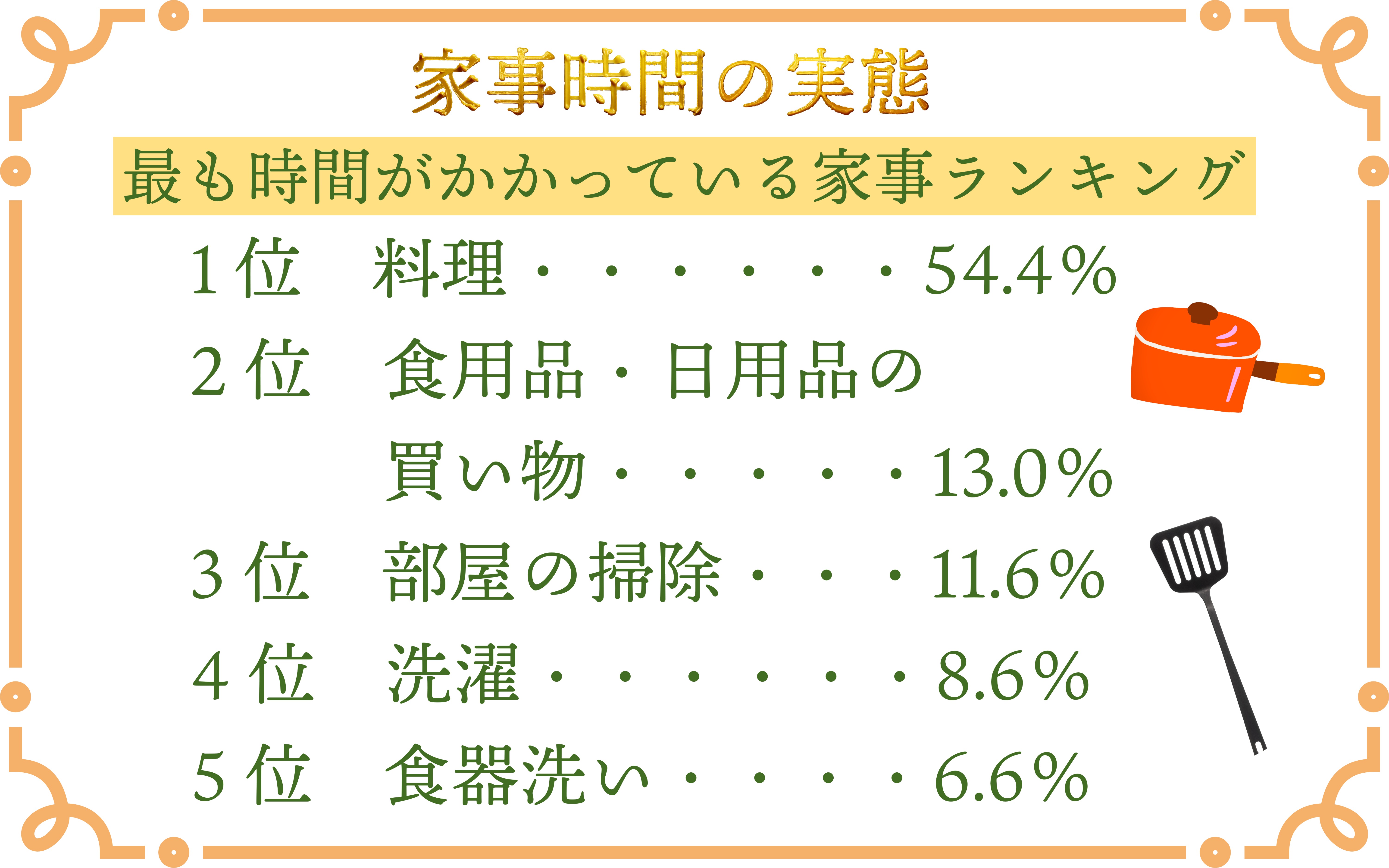 さらにその中で最も時間がかかっている家事として「料理」が挙げられ、