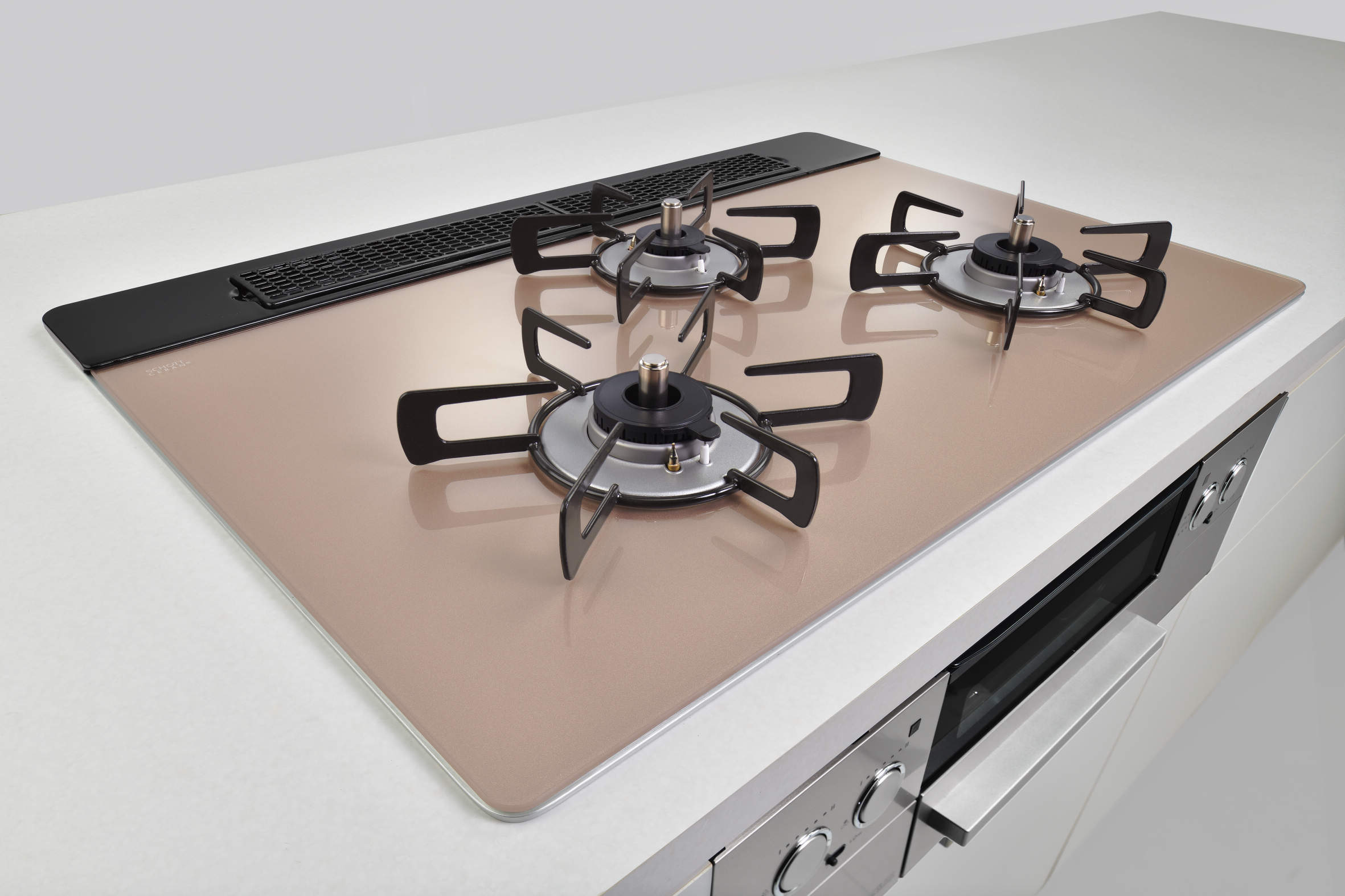 高硬度ガラスを一面に敷いたトッププレートはバーナー周りも段差がほとんどなく汚れが隙間に入り込みません!